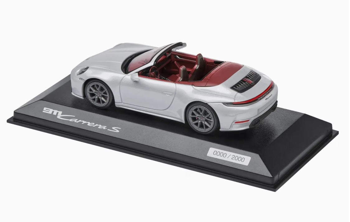 The exclusive 1:43 scale model of the Porsche 911 Carrera S Cabriolet 992.2 showcases impressive attention to detail and deserves its place in any collection. The packaging provided also makes it the perfect gift for all Porsche fans. Die-cast. Ice Grey exterior, Red interior. Convertible top in Red.